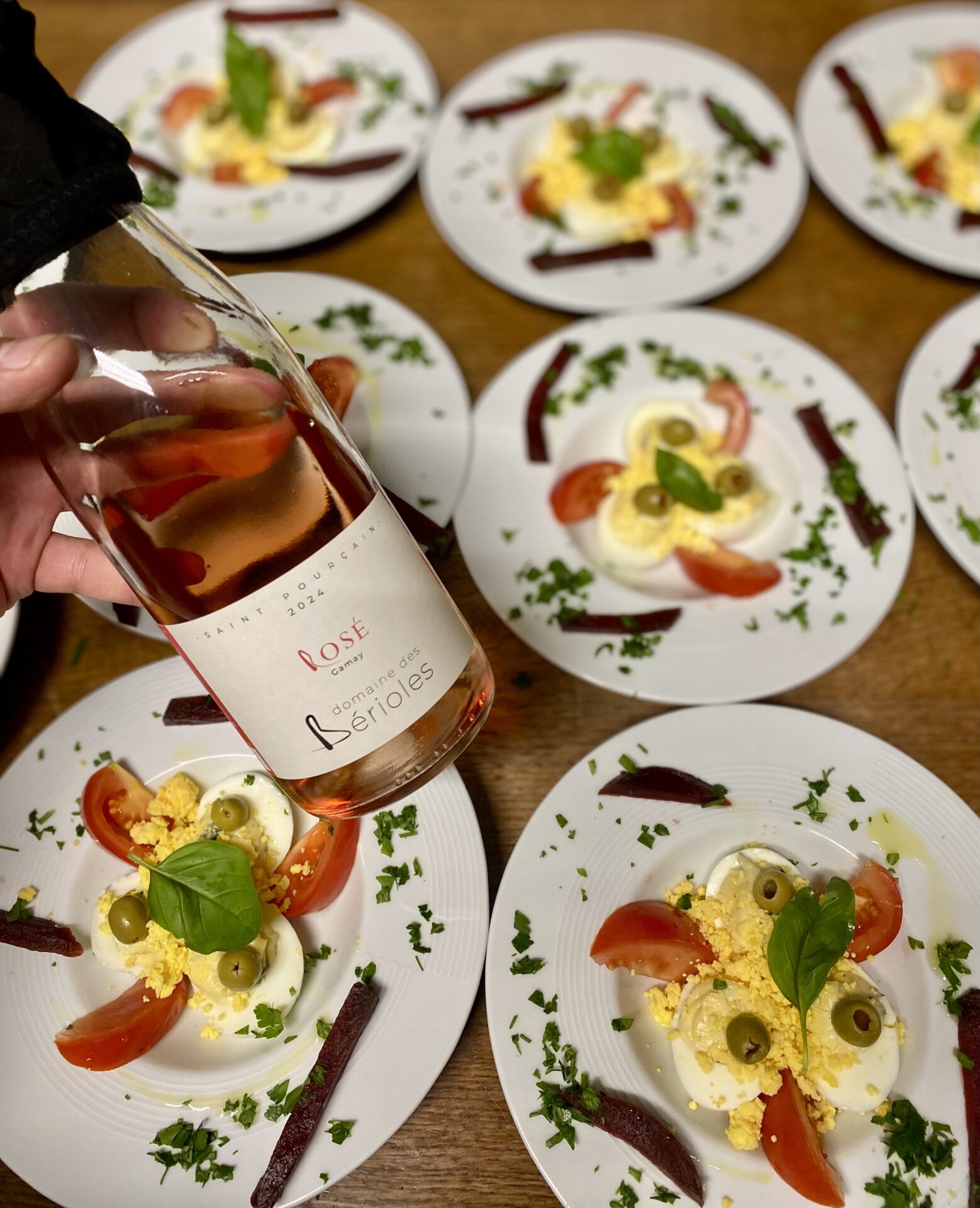 En accord avec des œufs mimosa, tomate, basilic et betterave.