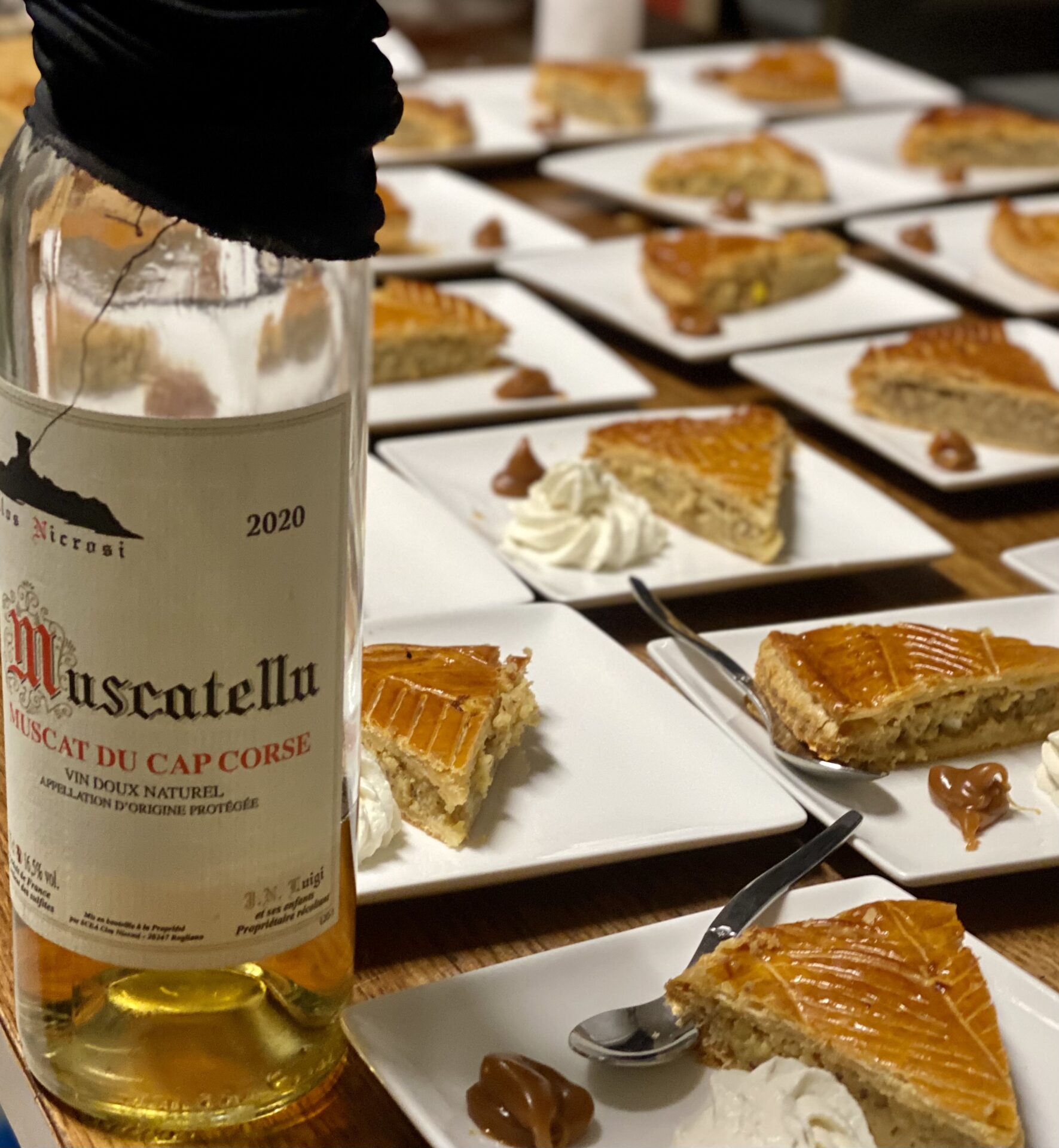 Muscatellu 2020, AOP Muscat du Cap Corse, Clos Nicrosi, en accord avec une galette des rois, crème chantilly et son caramel de la Boulangerie Pâtisserie 213.