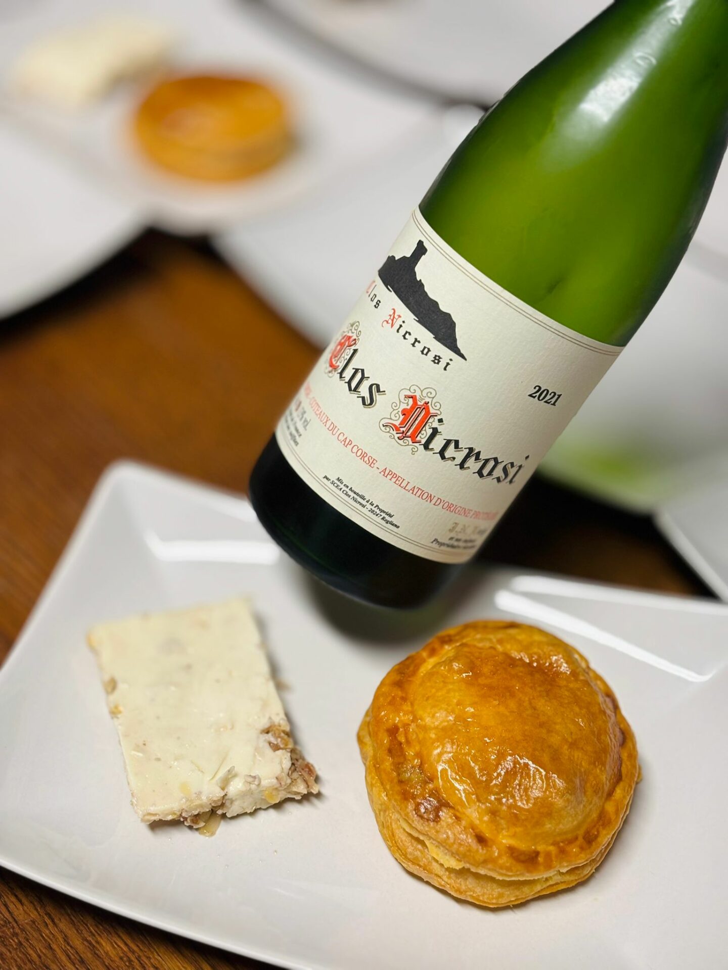 Clos Nicrosi 2021, AOP Coteaux du Cap Corse, Clos Nicrosi WINE, avec un nougat de chèvre et une tourte à la brebis.
